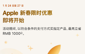 1月22日消息,苹果中国官网现已上线新春限时优惠活动,用户于2026年1月24日0时1分至1月27日23时59分以符合条件的支付方式买指定产品最高立省1000元。